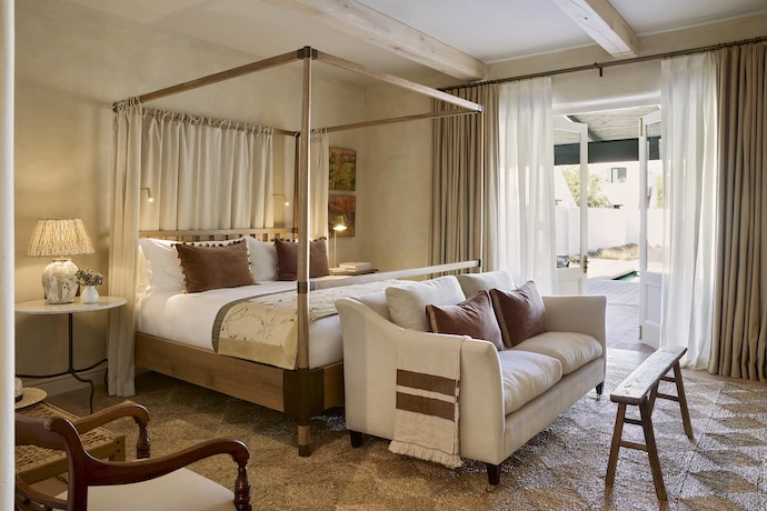 Jacques’ interiors lean on a philosophy of ‘less is more’, but never sterile minimalism. Instead, they celebrate craftsmanship and the subtle imperfections of the handmade to add a sense of story to each space. From blanket stitching inspired by 300 years of Cape embroidery tradition to bed throws created using indigenous plants in a centuries-old steaming technique by artist Ingrid Bolton, the villas are rich with detail that is both artisanal and deeply local. “For guests, it will feel like you’re sleeping under the fabric of the garden,” says Jacques.