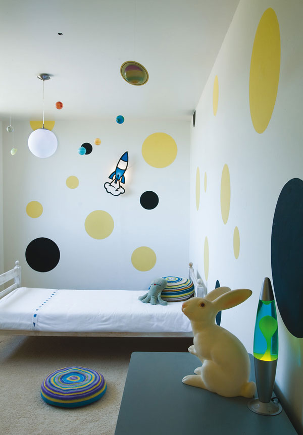 – One bright painted or wallpapered wall is fun and creates a focal point in the room, while a small area for a blackboard wall encourages drawing.
