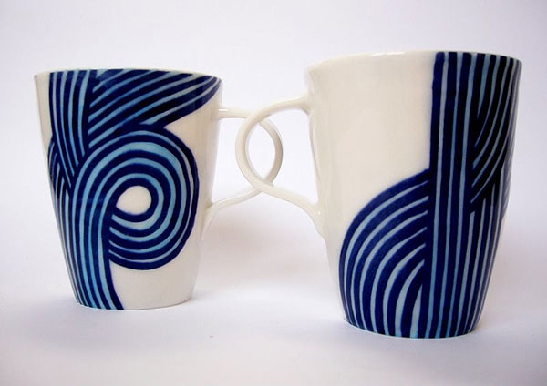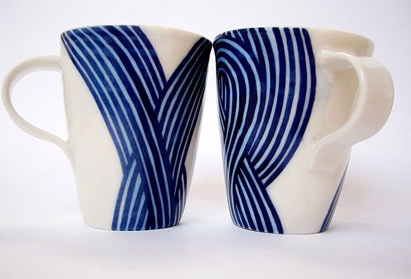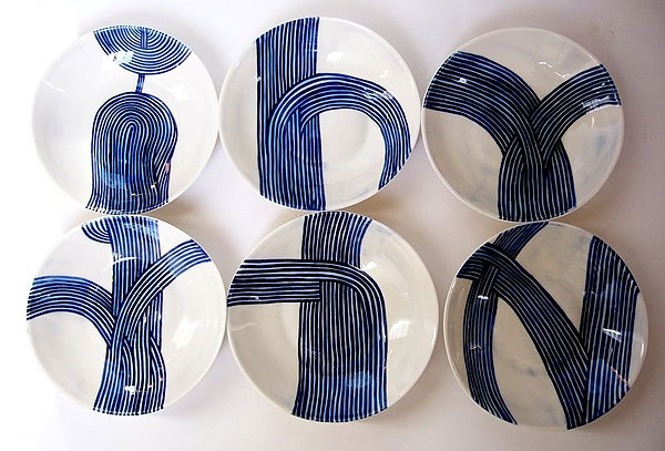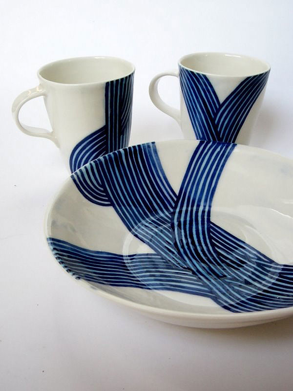 Most of my designs take ages to filter through the layers of limestone in my head! This collection started off many years ago, with an appreciation of the way stripes are used in African art, which is difficult to articulate, but I’ll try: confidently free-hand and organically uneven. This is what makes them so lively – not just the stripes, but more importantly, the negative spaces between them. I started to allow the stripes to wander over the shape of the different vessels (the way ploughed grooves follow the topography of a field), and even from one piece to another. The result is a design that feels integral to the form and not just another applied decoration. An unexpected bonus is the creation of a new display each time they are put out – on the table or on the kitchen shelves.