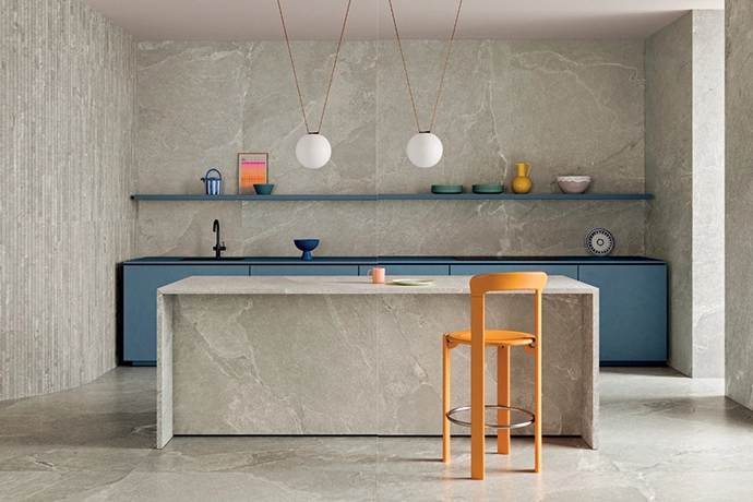 With their modern yet slightly rugged aesthetic, the Ardesia Grey porcelain tiles from Ceramica capture the movement and detail of natural slate, and create an elegant neutral backdrop for the subtle injection of colour found in the blue cabinetry, mustard chair and select crockery.