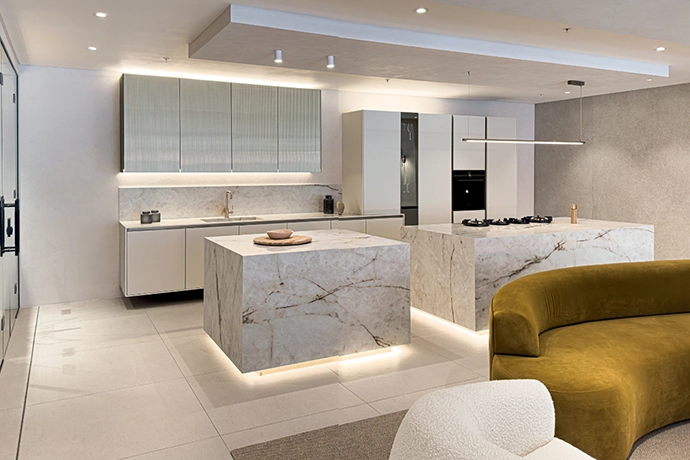 This pared-down, stylish kitchen by Nuuma integrates perfectly with the adjoining lounge area. Split marble-clad islands create flow, while layered lighting adds to the sense of openness and space.