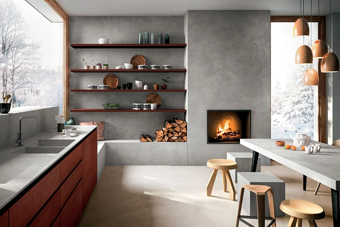 Embracing the essence of nature with wood tones, warm neutrals and the textures of Infinity Surfaces’ Metal Corten and Concrete Light throughout, this harmonious space feels grounded and inviting. The open shelving and cosy fireplace add to the organic ambience, making this kitchen a perfect retreat inspired by the outdoors.