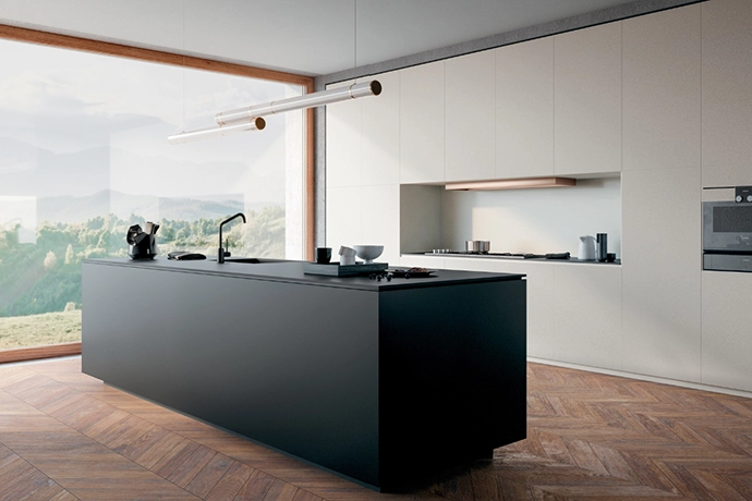 This minimalist design with a striking matte-black island by Infinity Surfaces as the focal point is both functional and bold. Set against neutral cabinetry and washed in natural light from the floor-to-ceiling window, the island provides a clever contrast to its surroundings, resulting in an elegant balance of luxury and practicality that’s perfect for contemporary living.