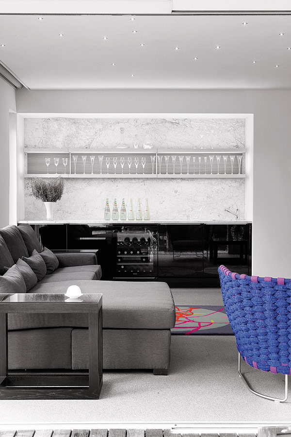 Maar toe die argitek eers hier invaar, het hy en mev. H. gou-gou ’n hele klomp ánder veranderings in die mou begin voer. “Hulle het aan omtrent alles behalwe die slaapkamers en die wynkelder gewerk – van ’n instap-yskas en tuis-outomatisering tot ’n nuwe afdak, waskamer en ’n aantrekkamer vir ons slaapkamer.”