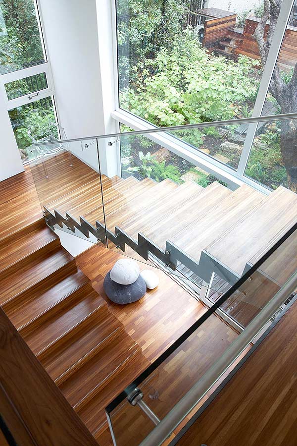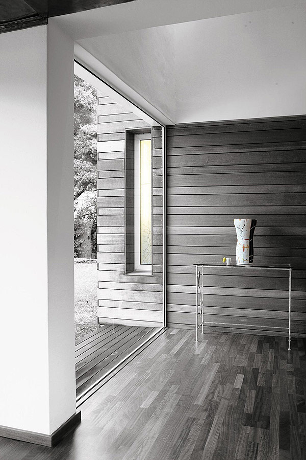 Visser Kapperer De Bruin-argitekte, wat ook die gesin se vakansiehuis in die Laeveld en hulle kantoor op die dorp ontwerp het, se oplossing vir probleem nommer een was ’n gang op drie vlakke wat terselfdertyd ook die nuwe ingangsportaal huisves. Die nuwe voordeur word aangekondig deur ’n swiepende koperdak, wat oor tyd ’n groen patina sal ontwikkel, terwyl die eenvoudige, minimalistiese ontwerp van die nuwe slaapkamer-en-ateljee-eenheid sorg dat dit nie met die bestaande huis inmeng nie.