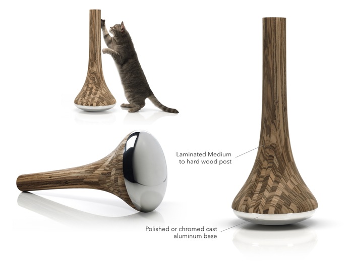 Kitty owners can say goodbye to shredded upholstery and claw-marked table legs with the invention of the Leo Cat Scratching Post. The wooden scratching column is stabilised by a polished 28cm diameter base, created to feature as a design piece, as well as a functional pet accessory. The post is constructed to maintain its overall shape and to camouflage scratches with contrasting directional patterns.
