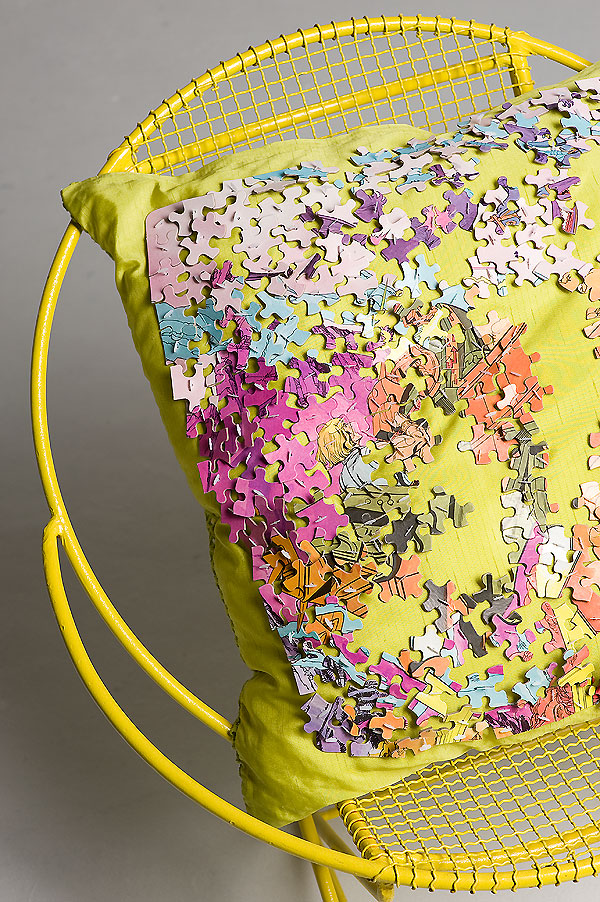 You can either rebuild the puzzle piece by piece (without the missing pieces, of course) on the cushion, or create your own random pattern.