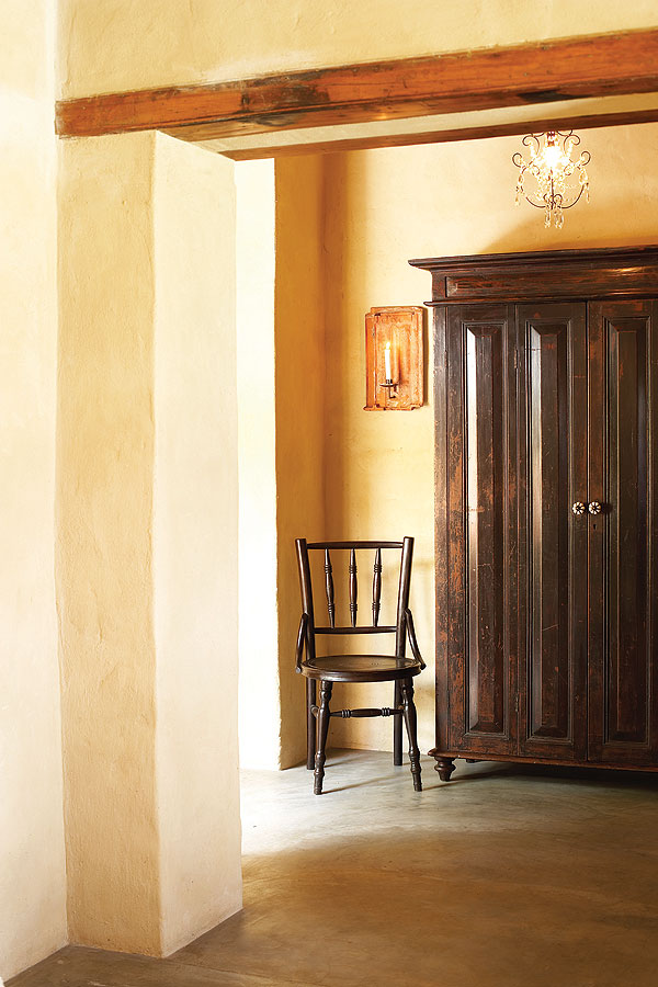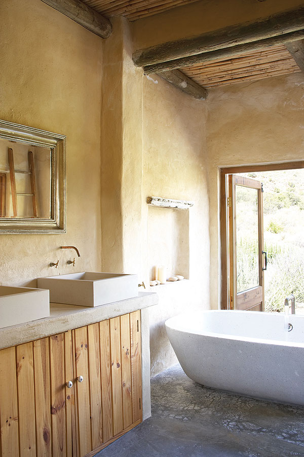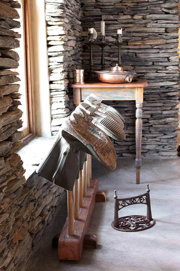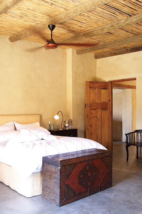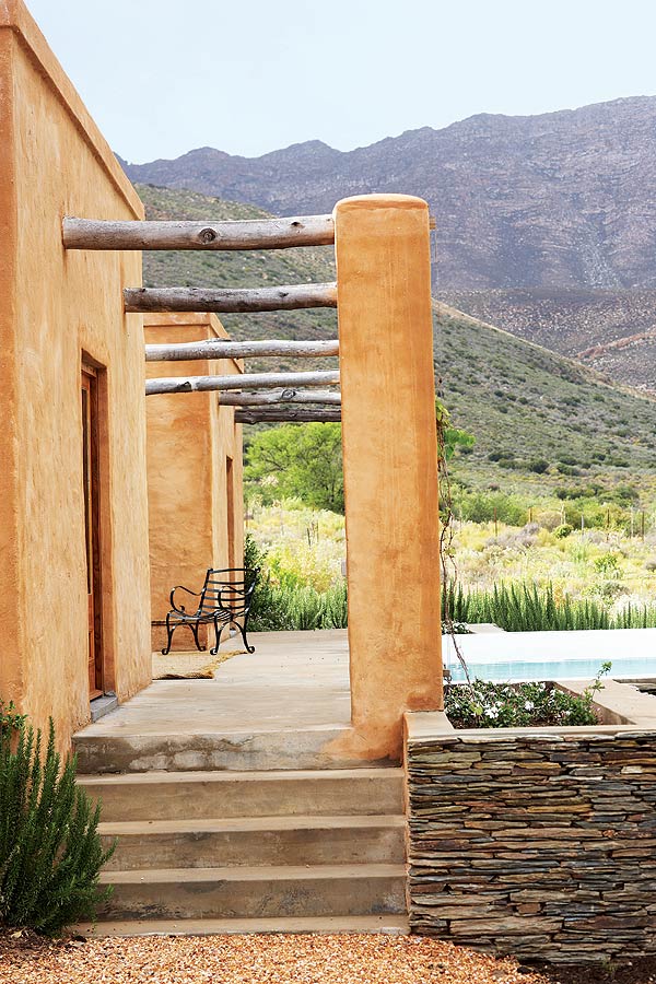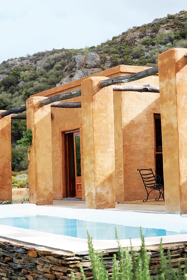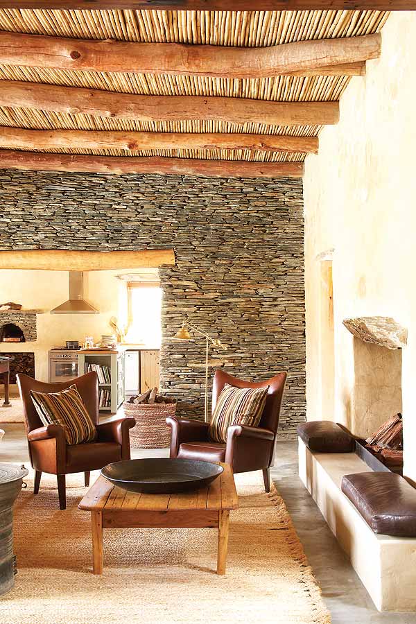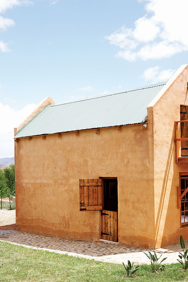 The slate lintels above doors and windows are reused fencing posts and milestones that once littered the veld or lined country roads in the area. One or two of them, at 2m long, weigh in at 300kg. Roof supports are gum, cut from trees in the river at the bottom of the property, while Spanish cane (Arundo donax) from a nearby vlei has been used for ceilings. Floors are simple, traditional Karoo polished cement, cool in the summer and easily heated by huge log fires in the winter.