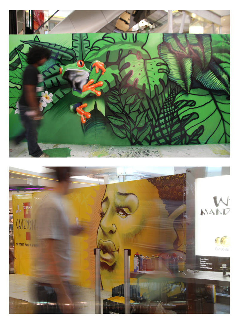 Graffiti artist MAk1One has created two new murals for VISI magazine at Cavendish Square. The murals – inspired by the botanical theme of our latest issue, and Cape Town’s imminent tenure as World Design Capital 2014 respectively – form part of the greater ‘LIFTED’ project, that aims to beautify the centre with work by local artists, designers, and scholars during a three month period of renovation at Cavendish Square.