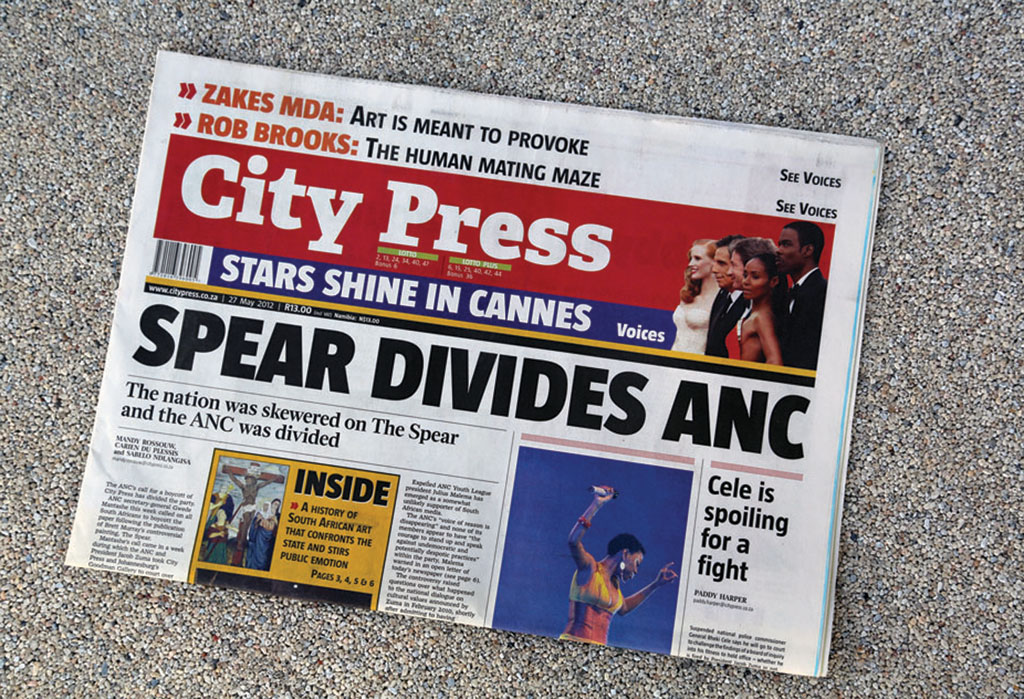 City Press Newspaper, 27 May 2012 edition by editor Ferial Haffaje : Novelist Lauren Beukes nominated the edition of City Press about The Spear painting. "It's a symbol of our fraught, messy, wonderful country and the problems we still face in talking about race and gender." SMS “MBOISA City Press” to 43431 to vote.|