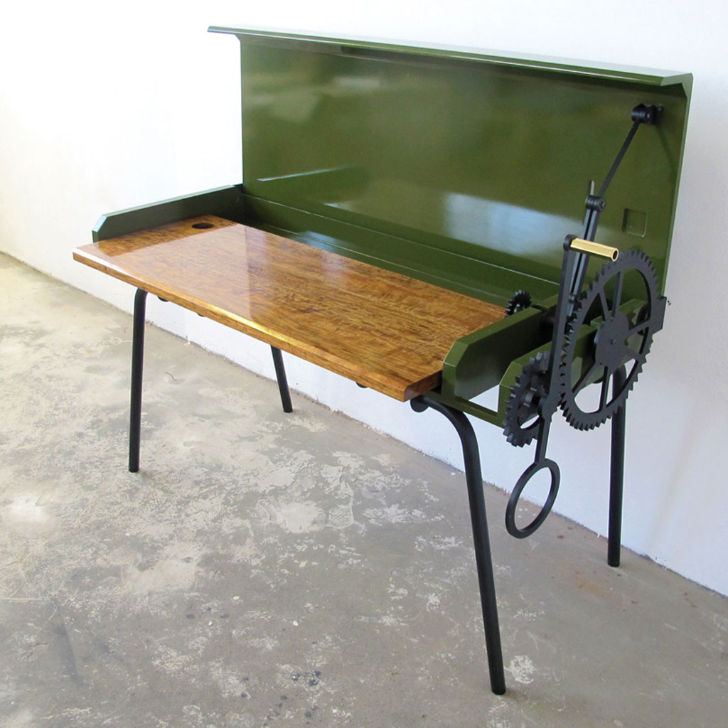 Mechanical Bureau by Joe Paine : Inspired by discarded farm machinery found in the Highveld, this bureau opens and closes using a system of gears and cranks. Nominated by our own Sumien Brink, "Small workspaces will never look the same again.” SMS “MBOISA Paine” to 43431.|