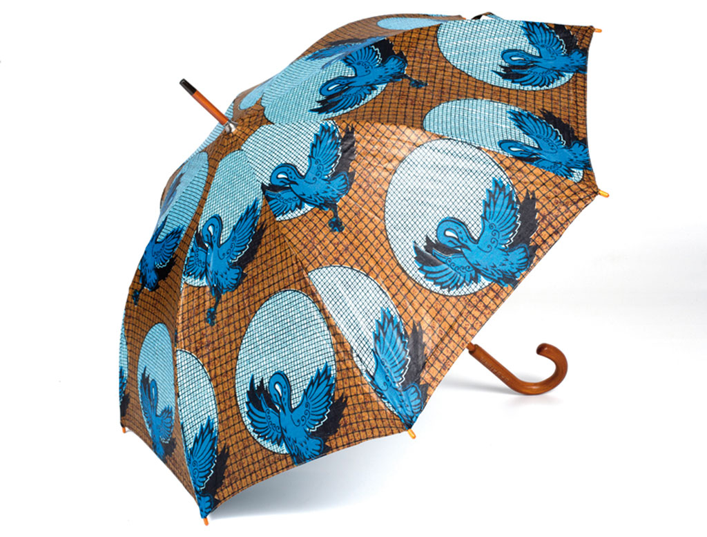 Zanzan Umbrella by Gareth Cowden, Babatunde : Nominated by ELLE editor Jackie Burger, Babatunde's range of bold African-print accessories combine fabrics from West and Central Africa with Western shapes. The umbrella is handmade with polycotton and a wooden frame. SMS “MBOISA Babatunde” to 43431.|