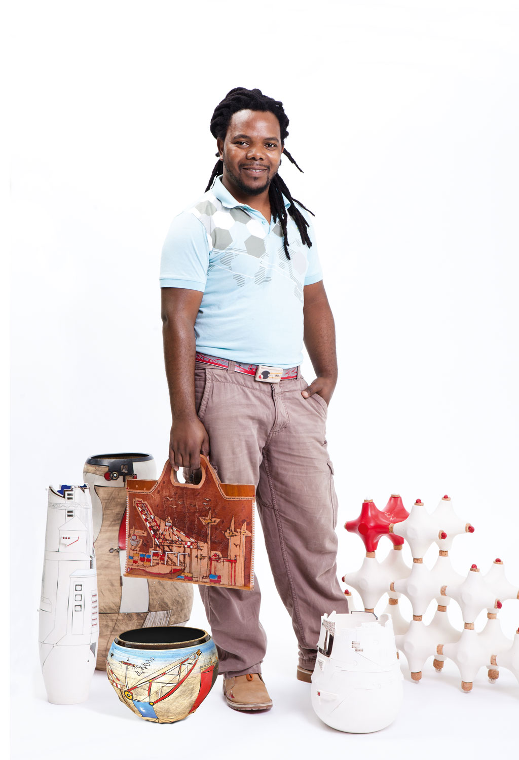 Despite having no training or knowledge of leatherwork, Andile has struck upon the radical innovation that is known as beginner’s luck. One day, he left a design on the kiln by accident and came back to discover a brittle misshapen work that cracked when water was applied.