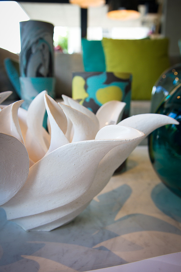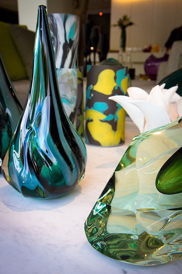 Pair some of OKHA designer Adam Court’s contemporary furniture pieces with sparkling glass “glaciers” and platters from master glassblower David Reade, or with one of Adam’s Solar mirrored screens, which light up from behind.