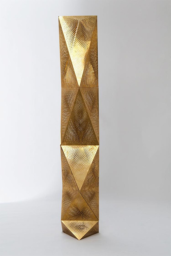 Etch is a series of digitally manufactured shades, a candle holder and tower. Made by employing a high-tech process used to produce electronic products, including circuit boards, the method allows for intricate patterns to be cut directly onto the metal.