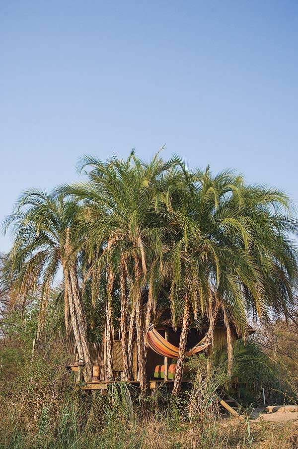 The trees dictate the structure of the tree houses, which are each stationed on a wooden deck with walls made from reeds and a thatched roof. ‘At Ngepi, nature is the masterpiece. Everything else (the accommodation, the game drives and the boat trips) is merely there to facilitate our interaction with it,’ Mark elaborates.