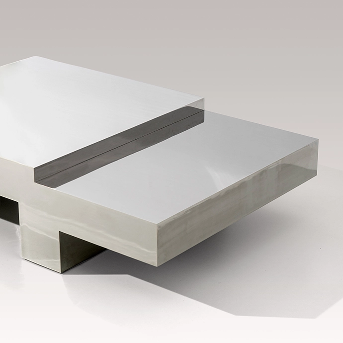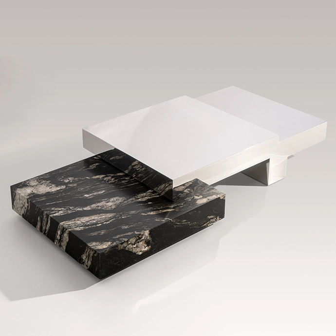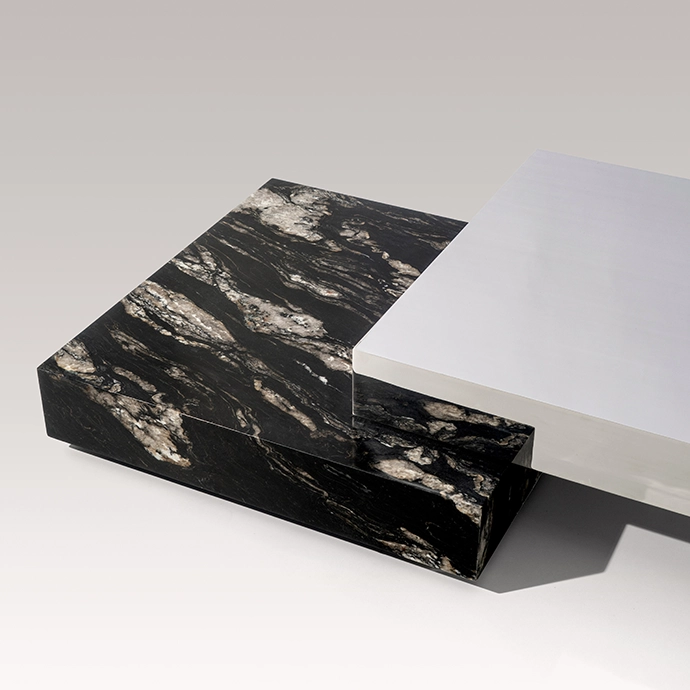 Proportion and geometry also play a vital role in anchoring the design within a living space. Low and architectural, the measured interval between the table’s volumes creates depth. “The relationship between the two volumes generates three horizontal planes, which gives the piece function without disrupting the clarity of the geometry. The leg detail lifts the stainless element just enough to introduce lightness,” says Adam. | okha.com