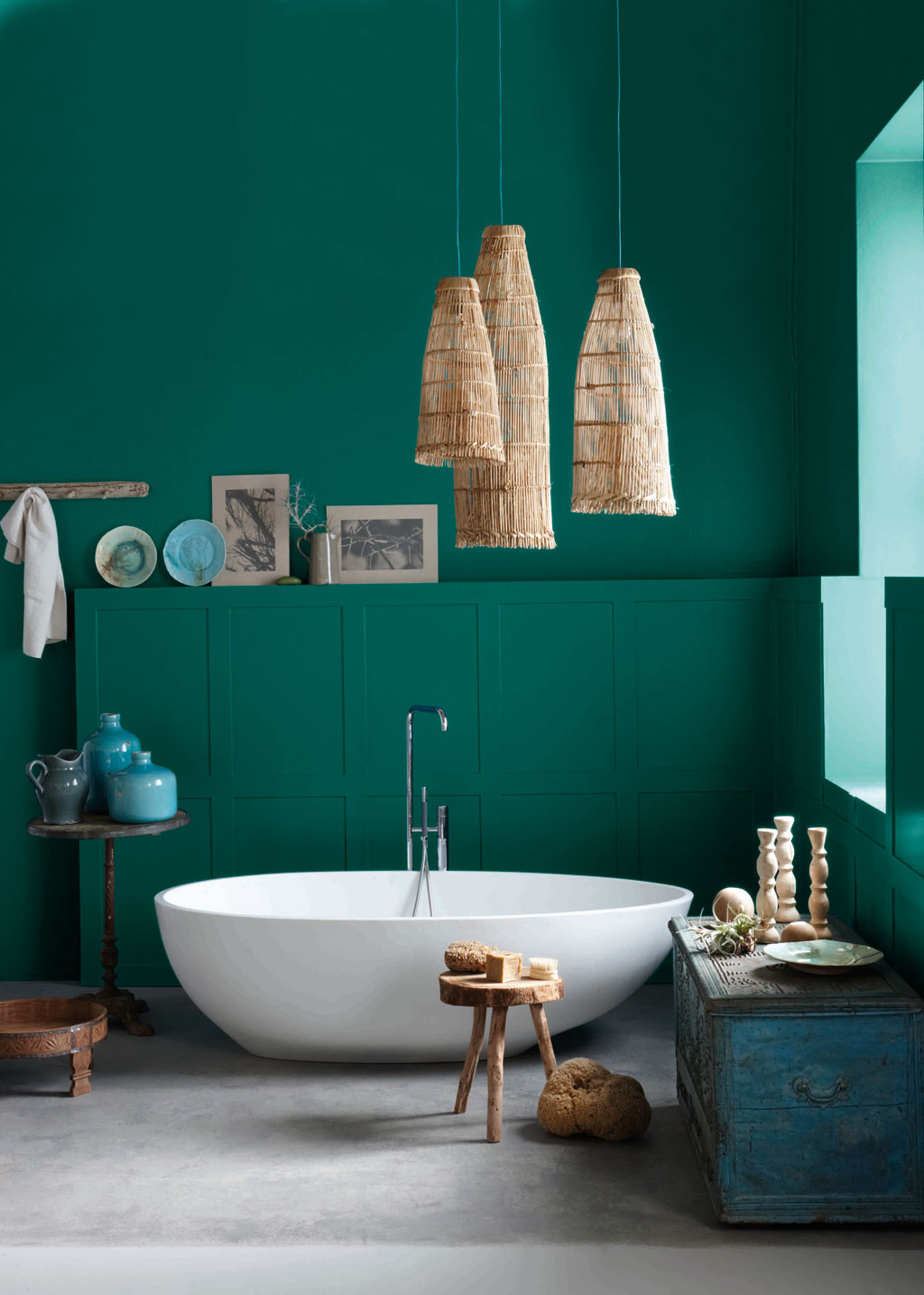 Undeniably eye-catching, this fashionable blue-green shade takes centre stage in a bathroom that invites a sudsy soak.