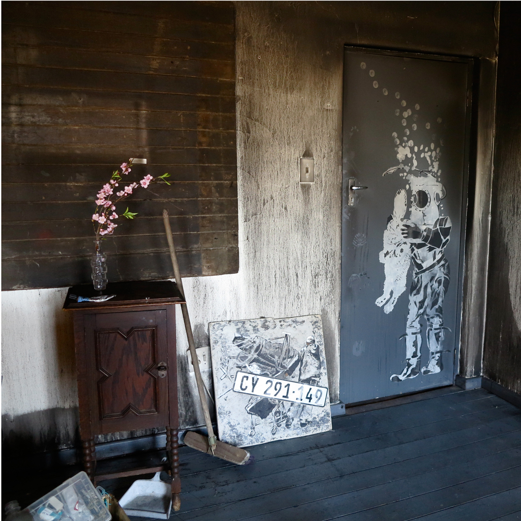 A week ago she sent me these incredible pictures of her studio almost totally destroyed by fire. Lisette call it “Burnt Offerings”. I love the tragic beauty of these pictures and the fact that she is using the soot to create new artworks.