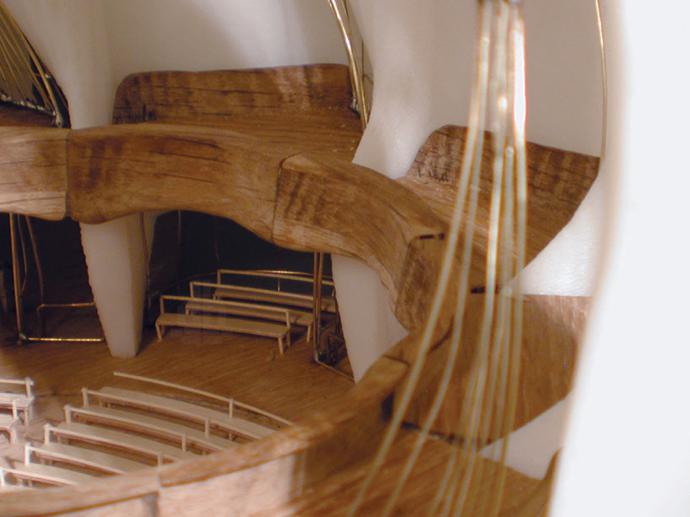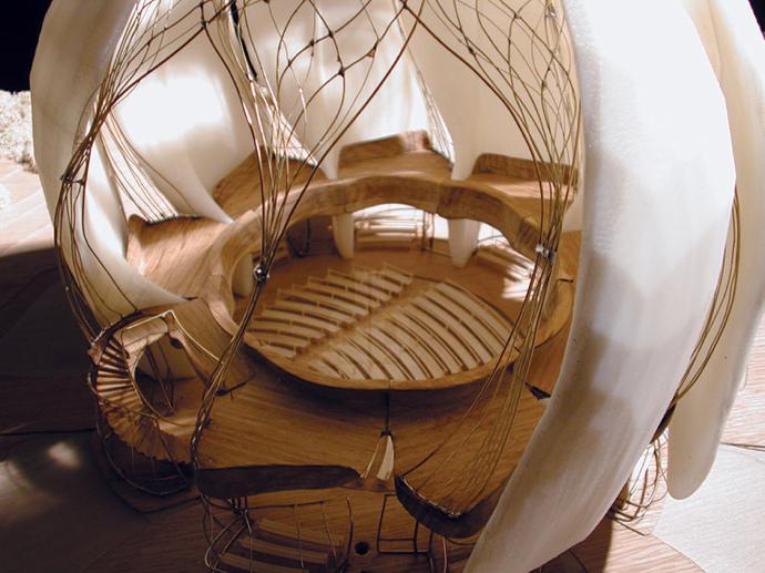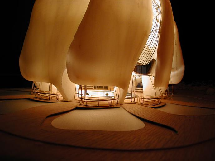 The intricate structure is built on a wooden base.
