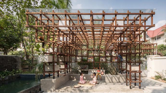 “This ingenious library and city farm hybrid in Vietnam was designed by Farming Architects as a way for children to learn about self-sustaining ecosystems,” says Features Editor Amelia Brown. “The large wooden climbing frame uses solar powered aquaponics to grow veggies and keep chickens and koi carp, and acrylic boxes house lights, planters for growing vegetables, and shelving units containing children’s books.”