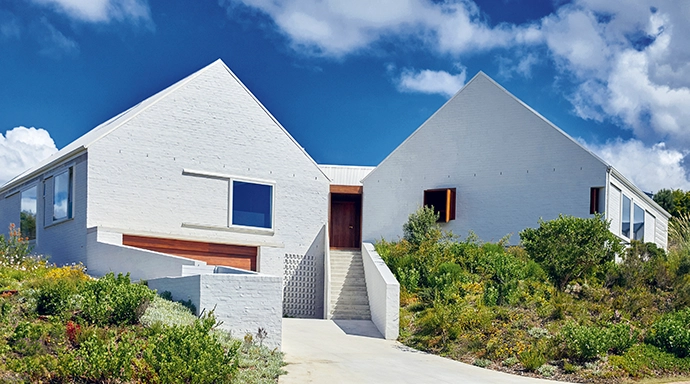 Guillaume’s final design consisted of a trio of linked, barn-inspired structures with a facade in bagged white brick, topped by “steeply pitched roofs in which the acute roof lines are very dominant”, he says. The creation of these three elements that combine to form the dwelling had its origins partly in the aesthetic and occupational parts of the brief from the Stewarts (one of the three sections contains Nina’s parents’ living spaces, for example), but it was also necessitated by the physical characteristics of the site.
