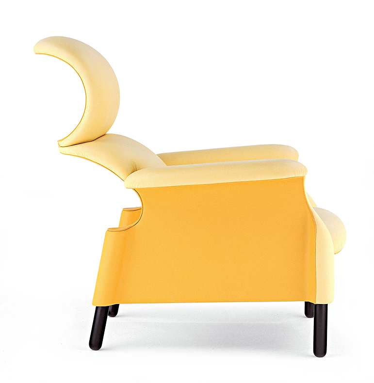 On the launch evening, a handful of Ferraris and Maseratis are parked outside the showroom, though this is more than mere spectacle: Poltrona Frau’s Interiors in Motion division (in conjunction with Pelle Frau leather) furnishes the interiors of the most prestigious international automobiles, as well as airplanes, yachts, helicopters and trains. To this end, the showroom display even includes a Ferrari seat, highlighting the sumptuous materiality and meticulous finishing.