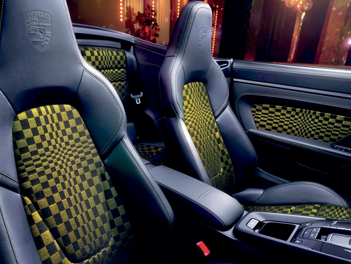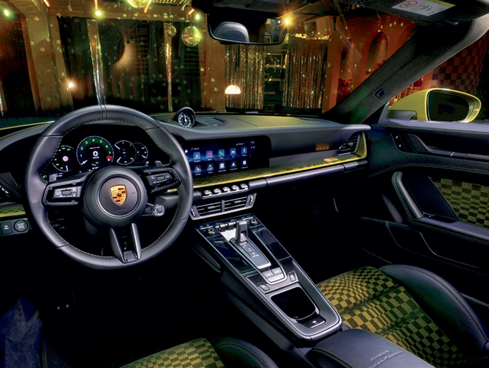 The ’70s theme continues inside the car with a wonderful reinterpretation of its famous “Pasha” chequered velour seat fabric – a popular choice for Porsche 911s, 924s and 928s back then. “Pasha is a reinterpretation of a start-and-fi nish-line flag, so it shows a lot of motion and emotion,” says Thorsten. “But for me, the old version of Pasha was also cosy and comforting. The interior features heritage Porsche crests on the steering wheel, a galvanised gold-plated limited-edition badge on the dashboard, and a leather option with contrast stitching in the Basalt Black club leather interior.”