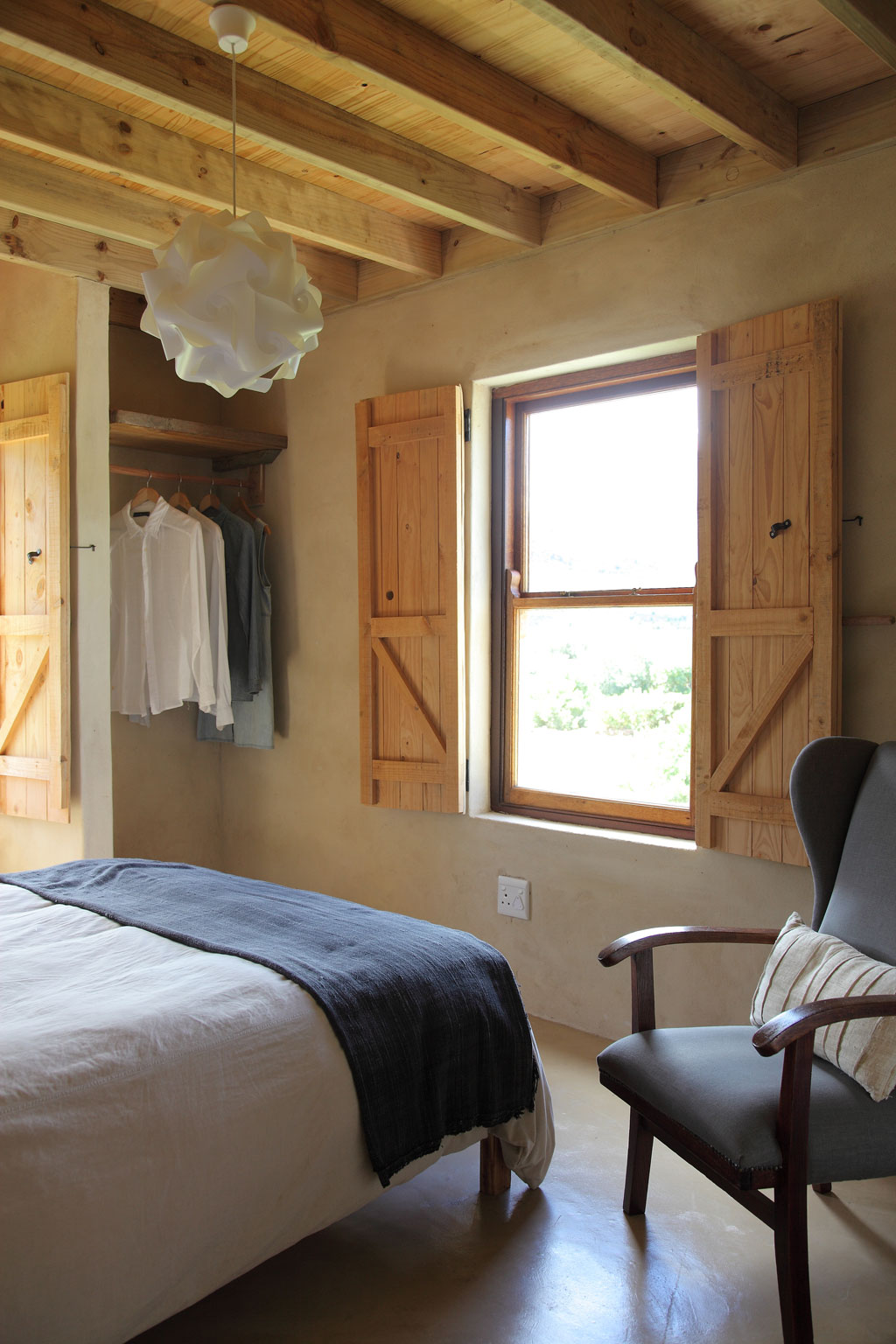 North-facing windows maximise natural heating from the sun and offer protection from the southeaster. A front veranda enclosed by stable-like wooden doors, which can be completely closed off from the extended open stoep, further ward off the Cape’s weather volatilities.