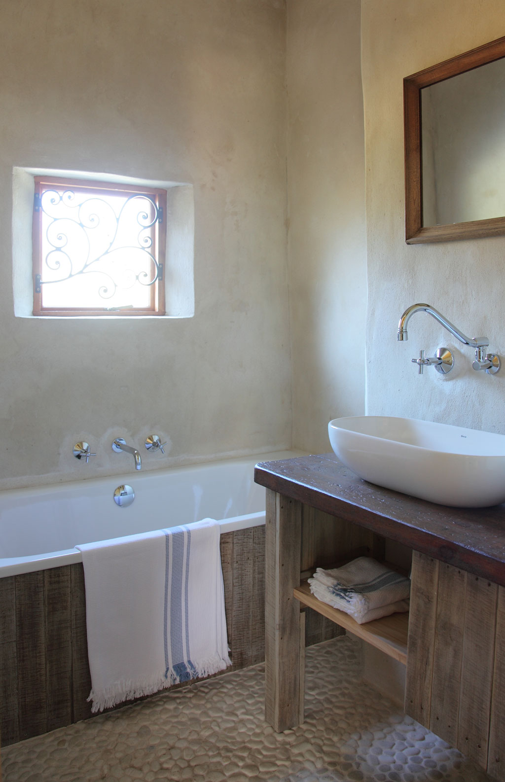 This minimalist approach is also clear in their decor choices, the extent of which entails a few small black candleholders on walls, and gatherings of felt rabbits on beds and tables, some disguised as tea cosies. The rabbits Kathinka collected from Karen Platje over the years who “has the most amazing felting studio in Stellenbosch”.