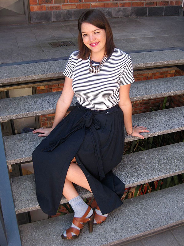 Kate Chauncey, better known online as The Pessimiss, is dressed in a striped top, a long, flowing mid-waist navy skirt, both thrifted of course, and grey socks with brown leather stack heels. Her pink, painted pout stretches into a smile every time a new topic on vintage fashion is brought up.