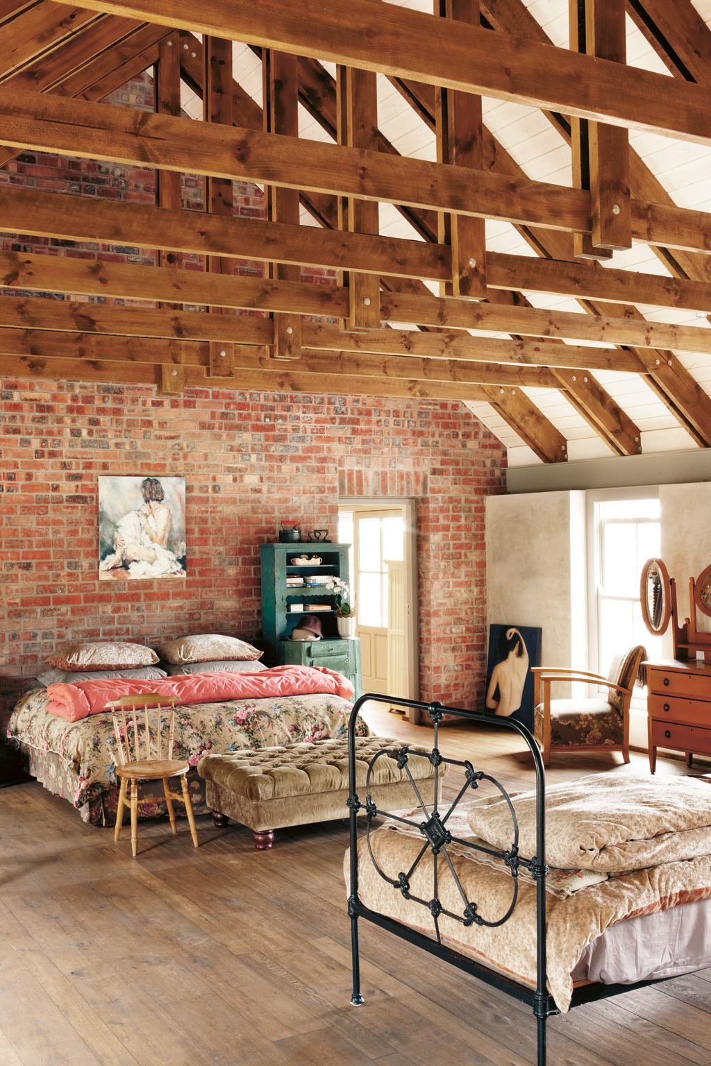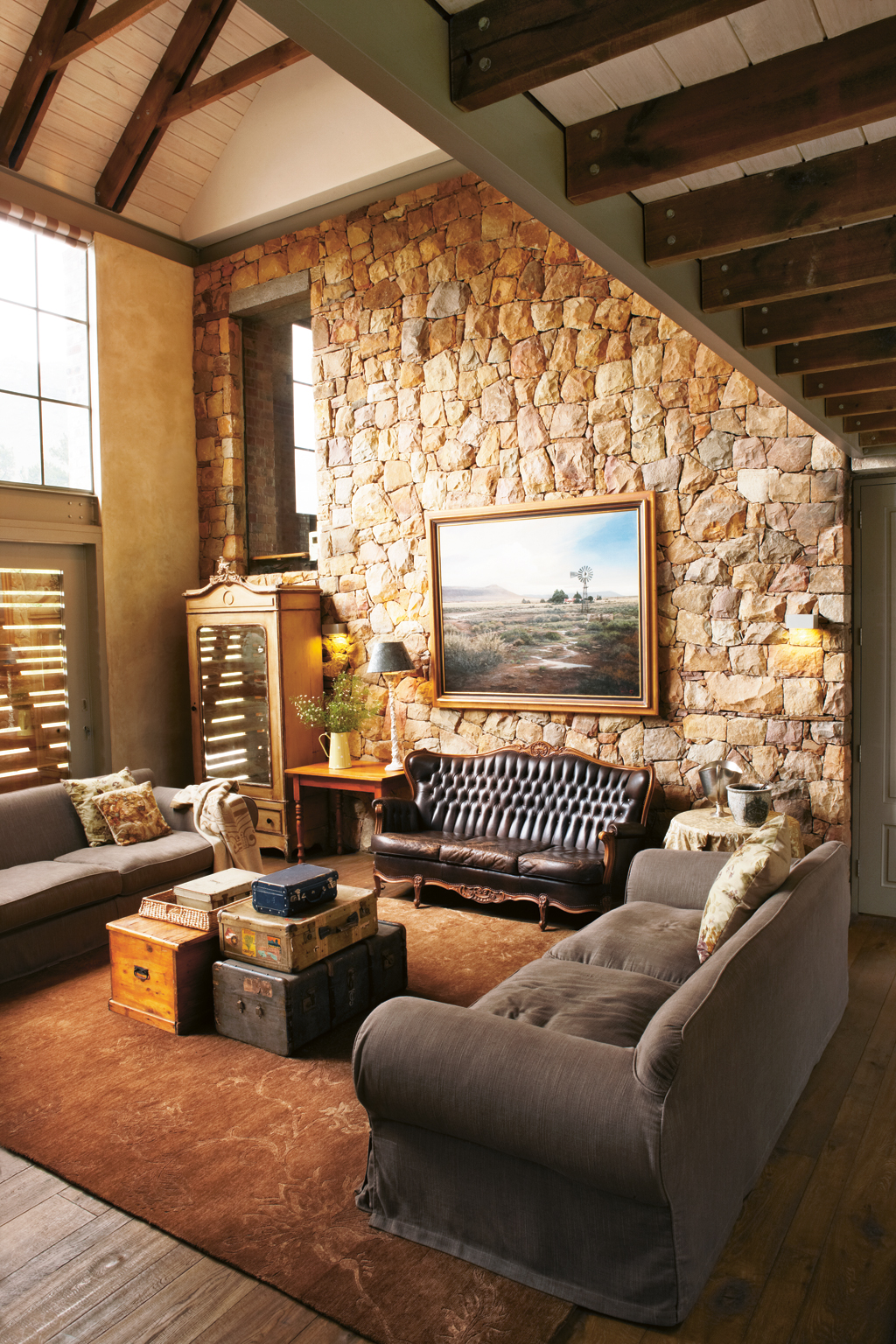 The house was originally going to be painted white but when it was built in a very basic stock brick, the pink-browns blended well into the mountainous landscape. Part of the material approach became the idea of “raw”, so we used raw timber, concrete and stone. There are also no tiles or applied surfaces inside. The walls are treated with white cement plaster and white Cobra wax, the ceilings are concrete and the floors oak. This honest relationship with the materials works well in the farm setting.