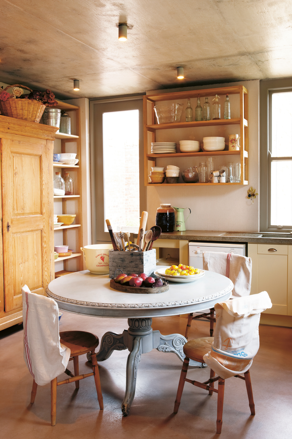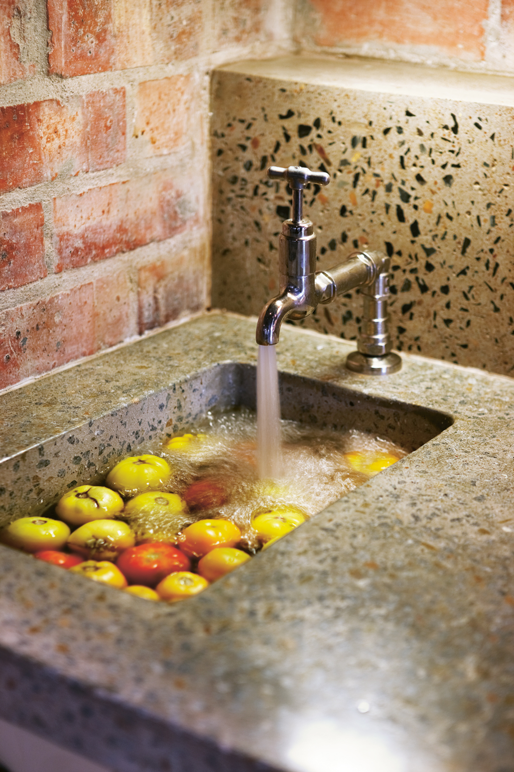 The deli feeling is continued with a large central counter – a modified piece from Onsite Gallery – and the collection of dining-room tables. The tops and sinks by Stucco Italiano are cast and ground-down concrete. Instead of the standard grey aggregate (stones added to the concrete), we added 50% brown stones to give the concrete warmth.
