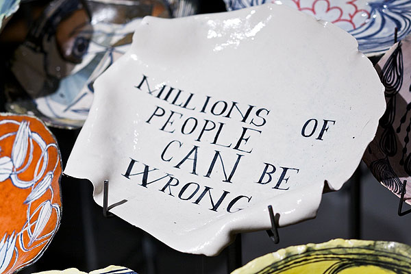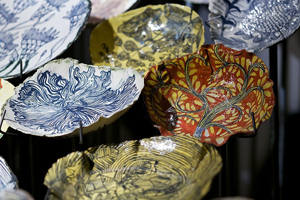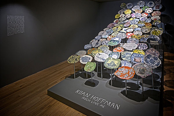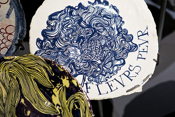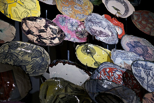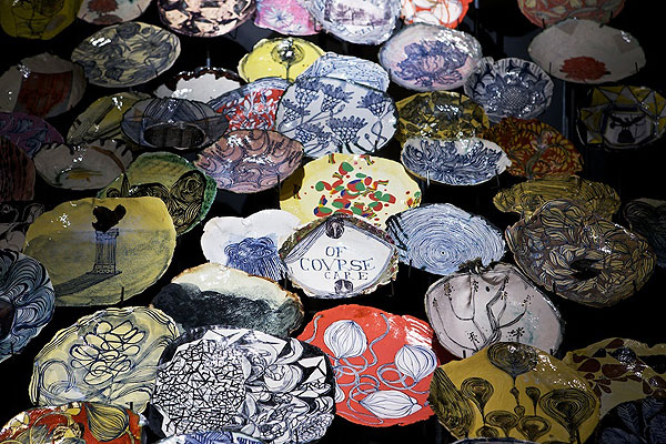 The exhibition, entitled “Much Love Me”, consists of 100 of Ruan’s artfully crafted ceramic plates. All the artworks have already been bought by Anthropologie and they’re reselling these in New York. We’re totally enamoured with the layout of the plates, which sit atop steel rods: an excellent display for an interesting collection of Proudly South African art.