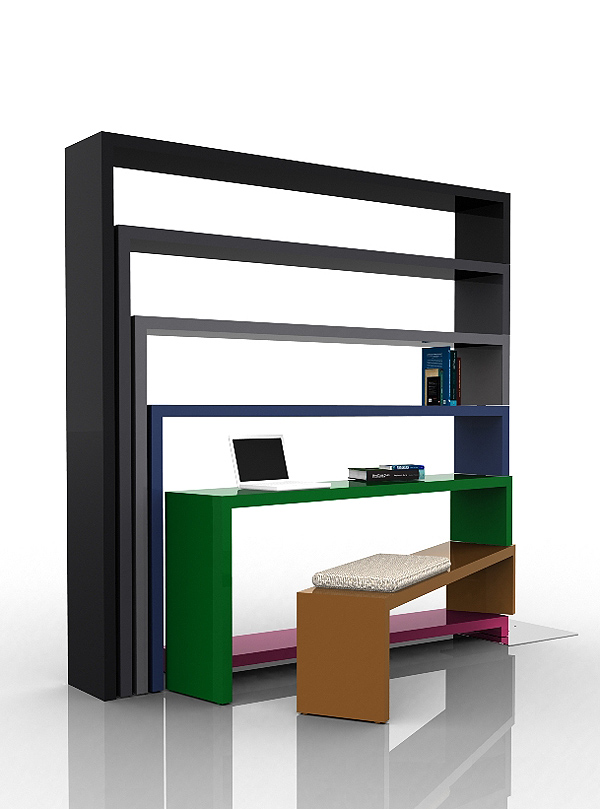 But the unit is really ideally suited for the home. Its innovative, rotating construction allows it to be used as a space divider, a TV unit or a shelf to showcase products. Other configurations range from a compact home-office space to a versatile hospitality server in corporate pause areas.