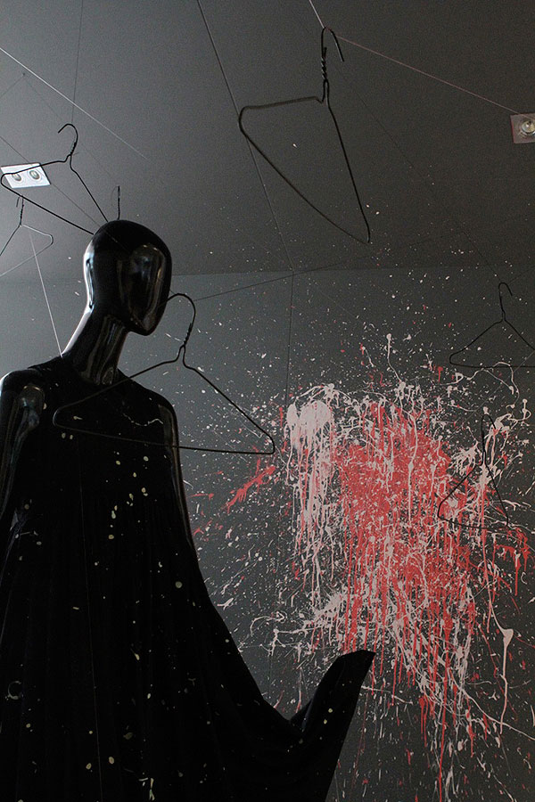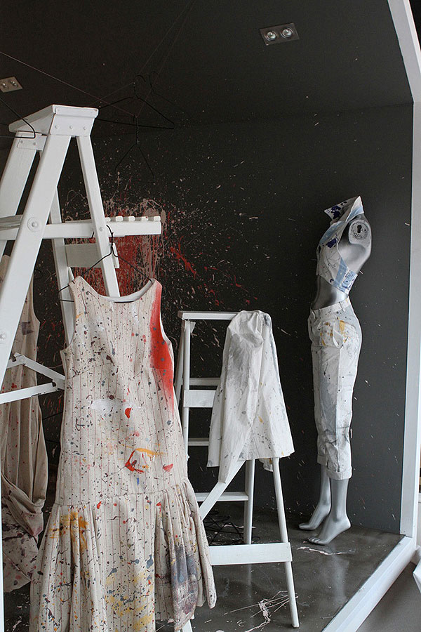 Respected stylist and Freeworld Design Centre consultant, Kerstin Eser, has created a clothing shop window display which features bespoke garments “upcycled” from paint-splattered overalls into “pret-a-porter” gems, created by Christopher Strong.