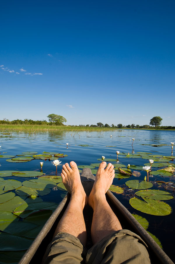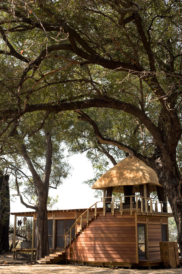Each of these luxurious spaces is like a Bedouin pavilion resting on a wooden platform. Two thirds of the circular walls are solid, the other third canvas so that woman can feel safe and man can eagerly listen out for dangerous animals sniffing at the zip. In his Okavango projects, Nicholas again used canvas for the Xaranna Tented Safari and wood with fly screens for it sister camp, the Xudum Delta Lodge.