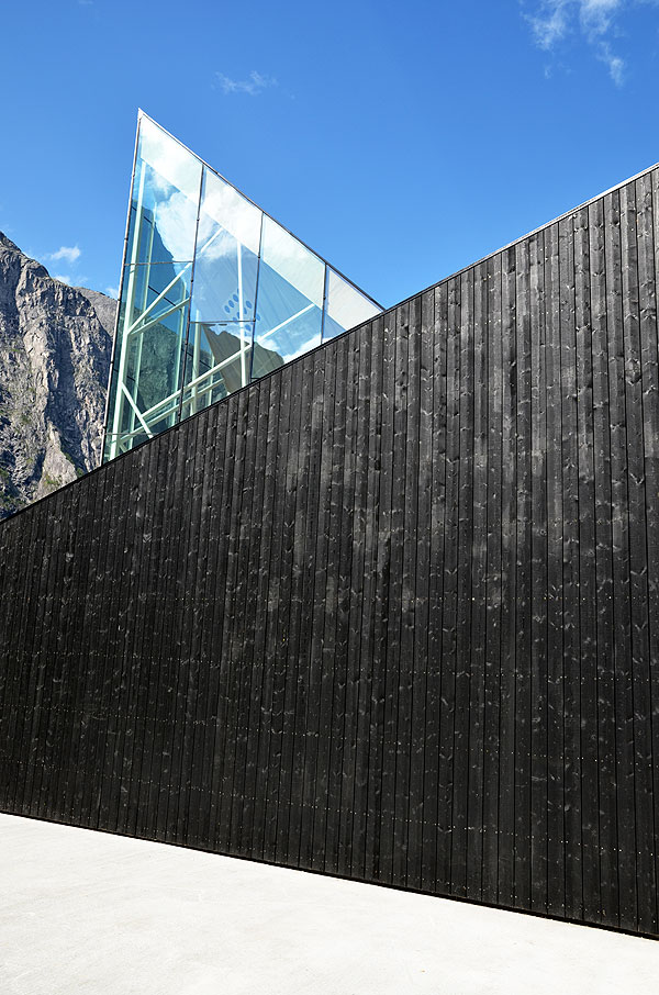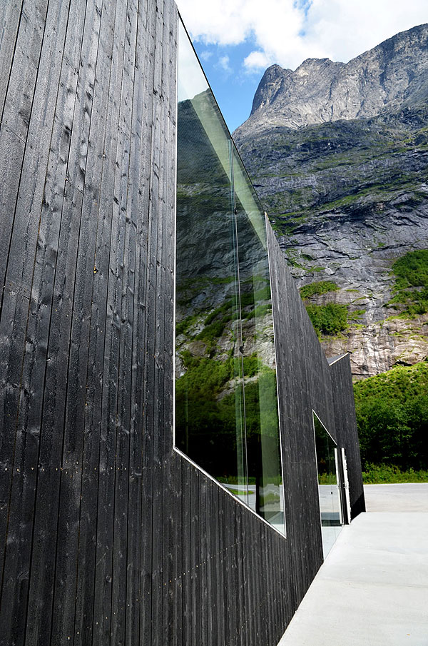 Criss-crossed structural beams support the structure of the Troll Wall restaurant, while also creating a striking contemporary architectural language. The elevation at the back of the building has been cleverly clad with charred timber, which does not only create an intriguing juxtaposition with the glass but also encloses offices and an information centre at the back of the building.