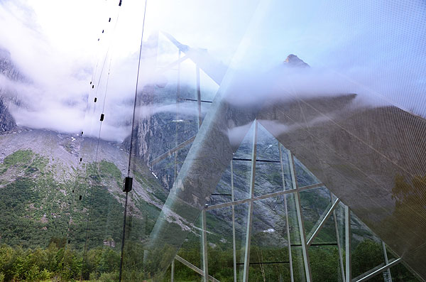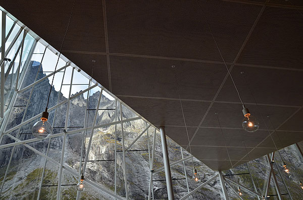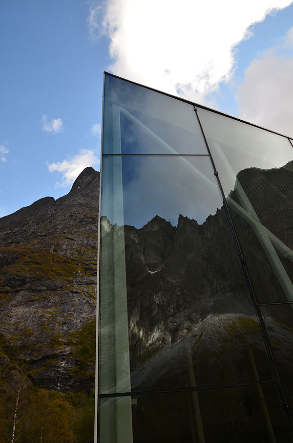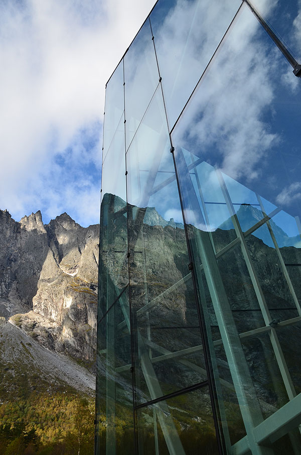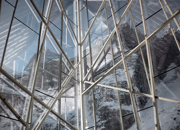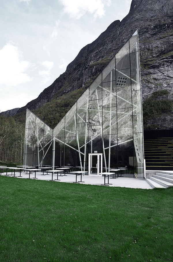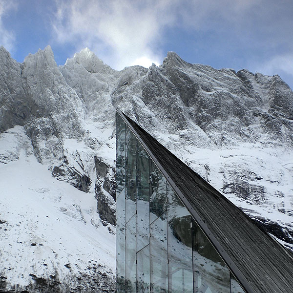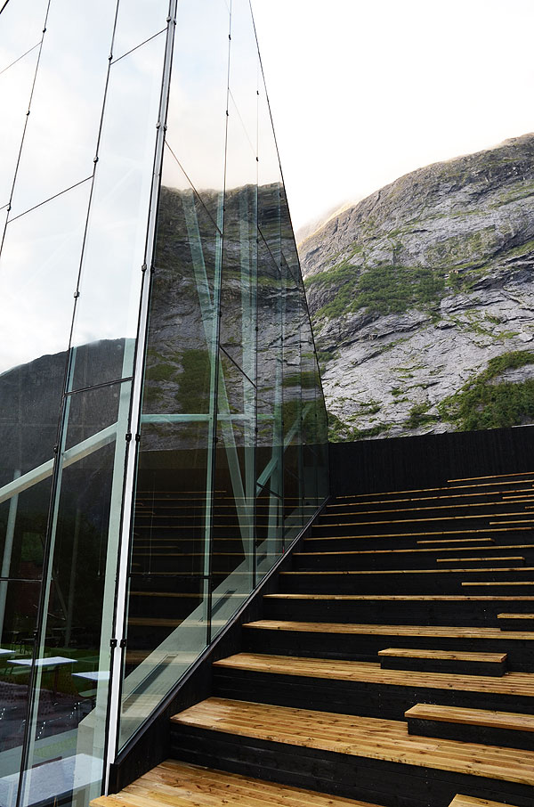 The jagged glass edges of the restaurant mimic the rock face and point up in the same direction. The full-height glazed glass walls ensure diners do not miss an inch of the impressive view, or the base jumpers taking flight off the sheer rock face. The use of glass also creates reflections of the dramatic mountain onto the building, glamorously camouflaging it into the scenic backdrop.