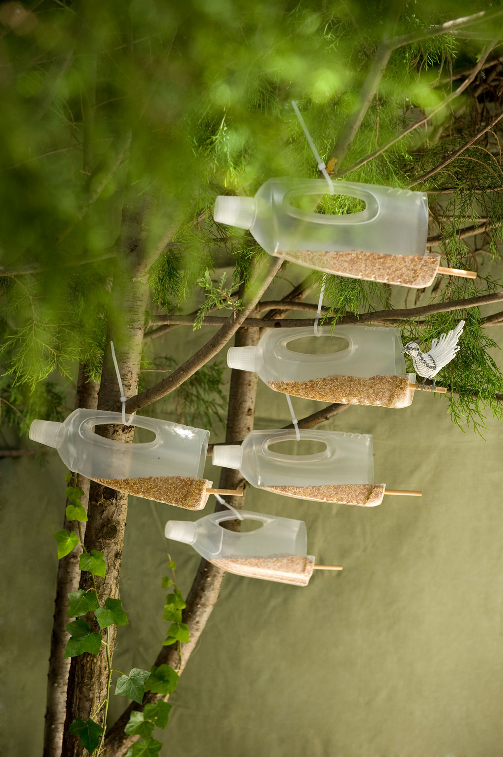 Thoroughly wash and soak the labels off empty household cleaner bottles and create a lunch-time pit stop for birds on the move.
