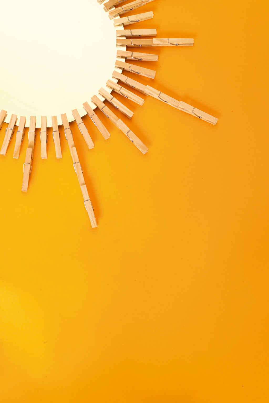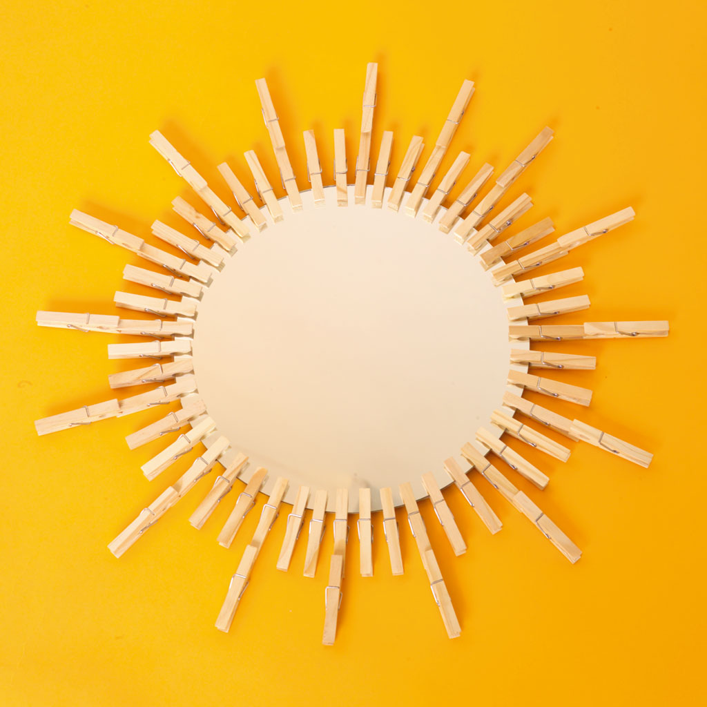 Use wooden clothes pegs to turn an old chipped round mirror into a tribute to American designer George Nelson’s famous 1950s Sunburst clocks.