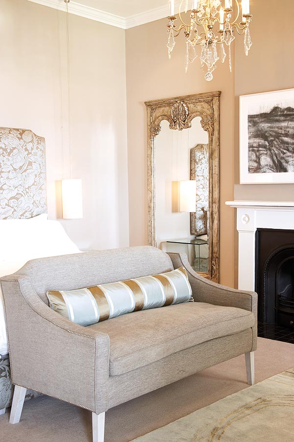 The result is a calm blend of old and new: dramatic headboards, lighting that goes from heavy crystal chandeliers to modern Italian designs, contemporary wingback chairs, baths with chrome taps, wooden and tiled floors and luxurious carpets, a texture- and wood-rich small library, a white breakfast room and art by local artists such as Johann Louw, Kevin Mackintosh, Daryl McGregor and Garth Erasmus.