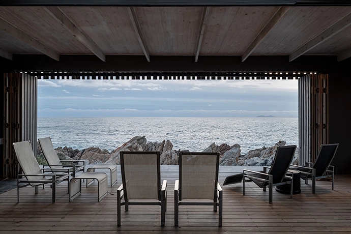 Designed to recede into its surroundings, the residence is clad in locally sourced cypress wood, which has naturally weathered to grey. To allow for the free movement of wildlife, the house is anchored to the rocks with elevated point loads.