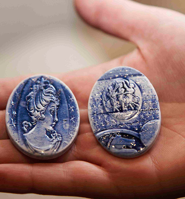 Take a dive into Delft : Local ceramist John Bauer combines Delft Blue with other historical aesthetics, like the cameo, in some of his covet worthy brooches. He says he is inspired by Delft's original inspiration - China. johnthepotterinindia@hotmail.com and roseymud@yahoo.com|