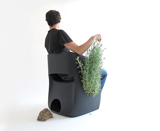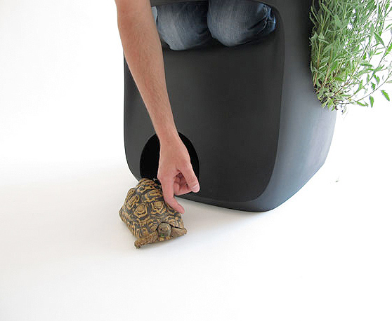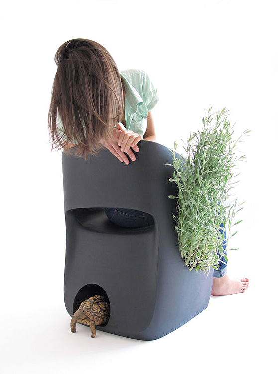 With “The Inner Life”, Spanish designer Martín Azúa invites the user to integrate natural processes into everyday life. The innovative chair is not only great for putting up your feet, it also features a plant container and a hole at the bottom where a rabbit, cat or tortoise can hide.