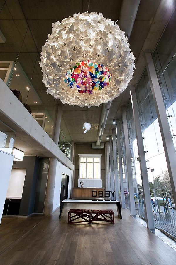 Those who work here can enjoy the finely carved Linen Fold sideboard by Koop Design and Angus Taylor’s huge Homage to Hermes lying in the garden. If you visit, you will stumble upon an upside-down angel by Beezy Bailey. Look up in the right placeand you will be amazed by a light called My Secret Place by Heath Nash.