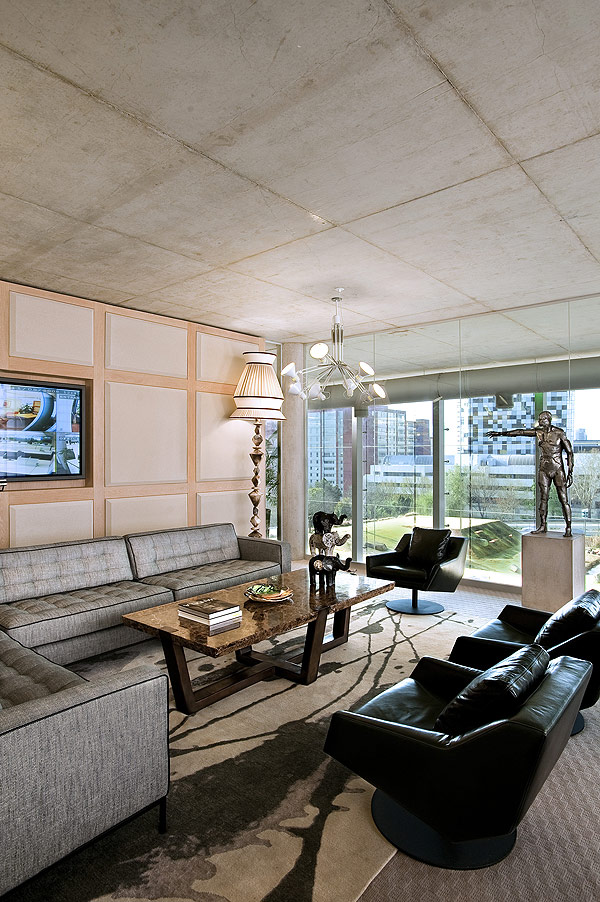 “The interior is a juxtaposition of clean space and highly ornate elements featuring pieces by a broad selection of top designers from around the country,” says Trevyn. “The owner is playful with an adventurous spirit and that shows in his choice of art.” This explains the life-size solid bronze gorilla drinks cabinet by Bronze Age for Southern Guild, which holds the champagne and glasses.