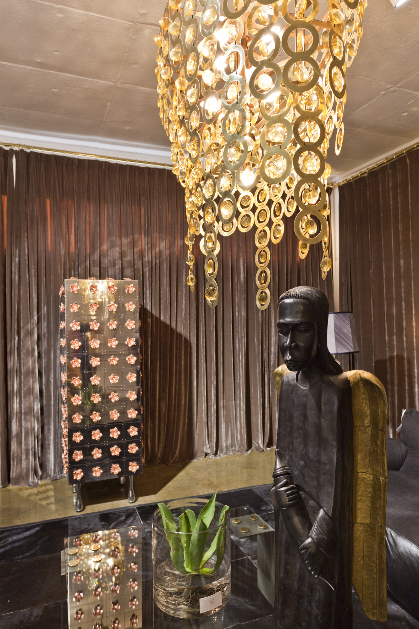 The next material on the Egg radar are sparkling semi-precious stones and there’s already a spectacular brass and jewel chandelier adorning the showroom.