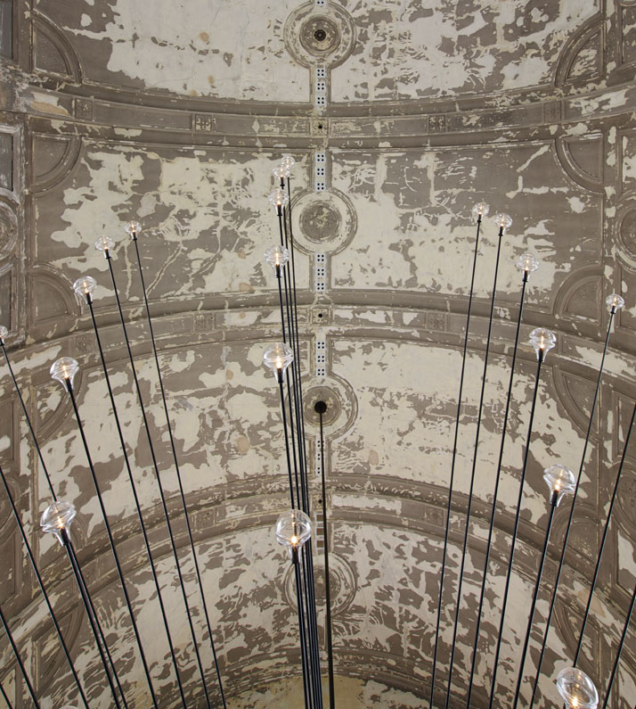 Classic arched ceilings and detailed mosaic flooring are some of the original features preserved by the design studio. They are contrasted with modern light installations, including a chandelier by PSLAB. Furniture is chic and current, playing with the pressed pillars and walls. The stained glass windows received a modification too, now representing contemporary designs as opposed to biblical scenes.