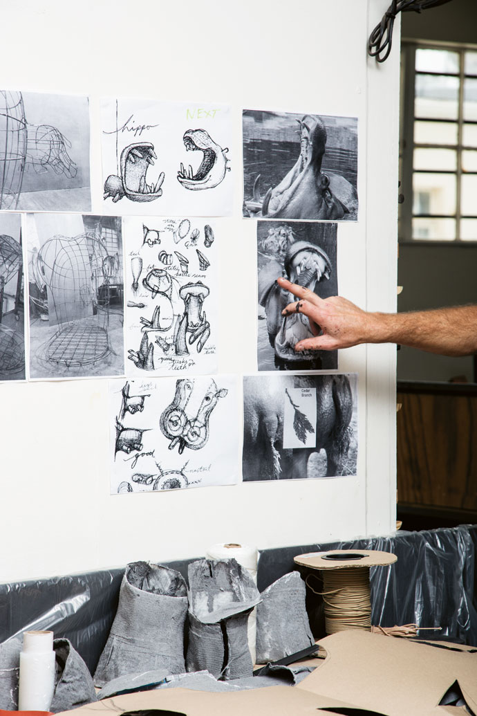 The demand for Porky Hefer’s human-sized leather nests, held within the Southern Guild Collection, is such that a client bought his latest work, a hippo named Grace, off a sketch. This is a snapshot of the design process.
